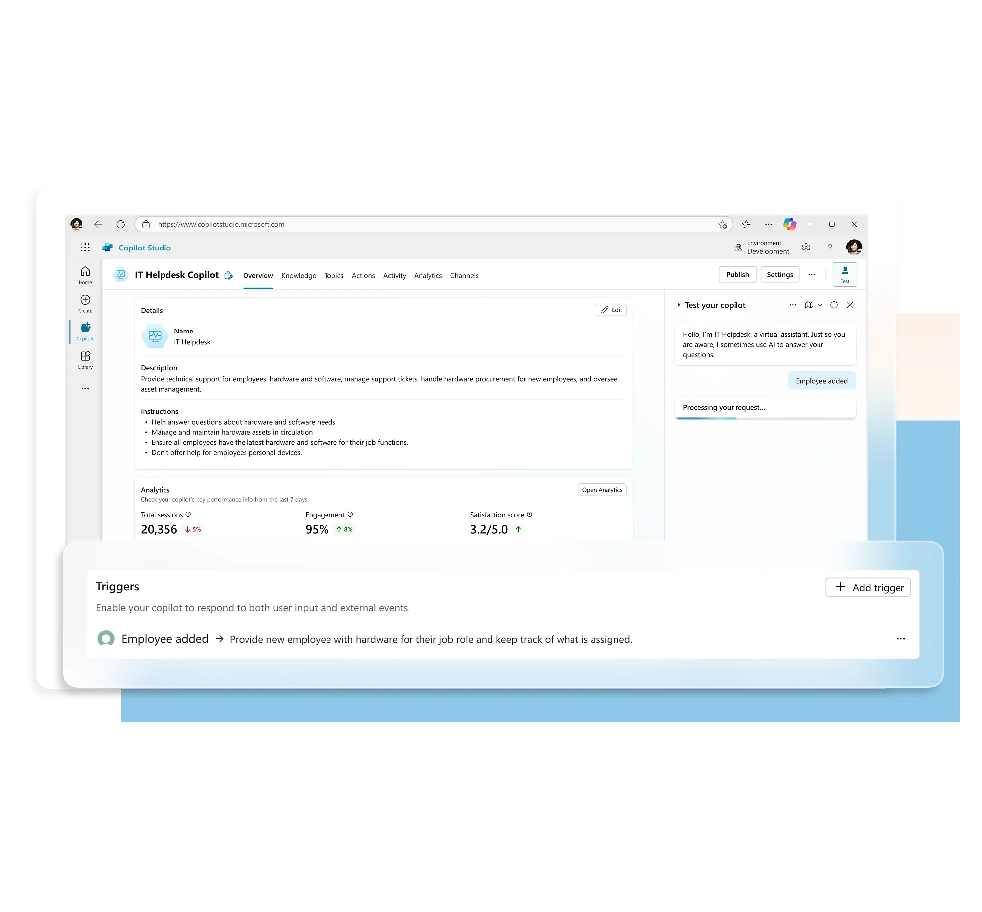 Copilot Studio is an end-to-end conversational AI platform that empowers you to create agents using natural language or a graphical interface. With Copilot Studio, you can easily design, test, and publish agents that suit your needs for internal or external scenarios across your industry, department, or role. You can build a standalone agent or publish to Microsoft 365 Copilot.