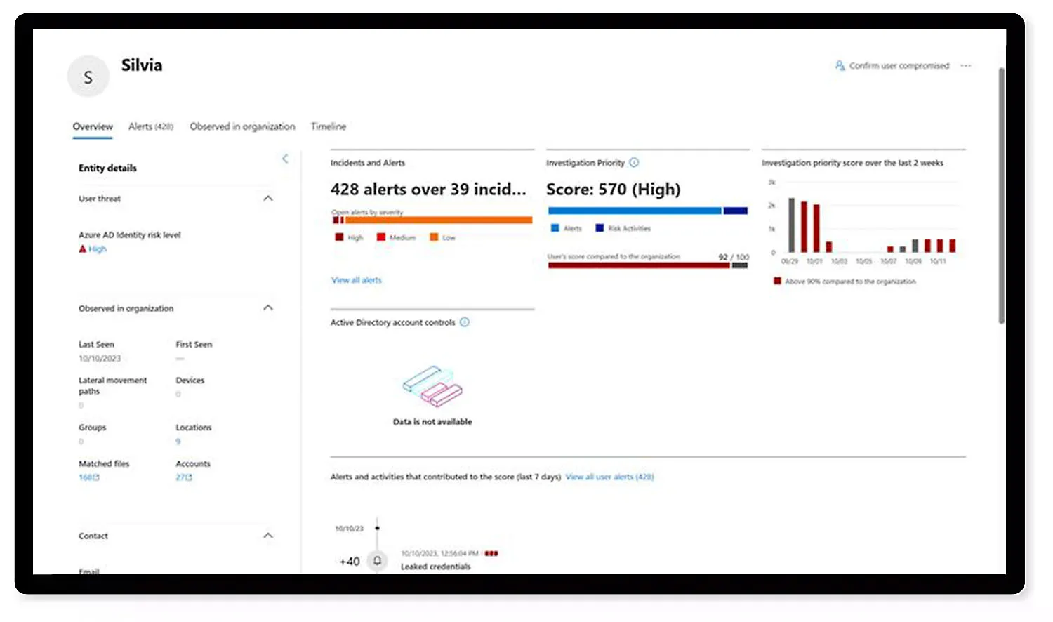 - **Investigate at-risk identities: **Explore detailed views of each unique identity’s activities, recent alerts, and overall risk score.