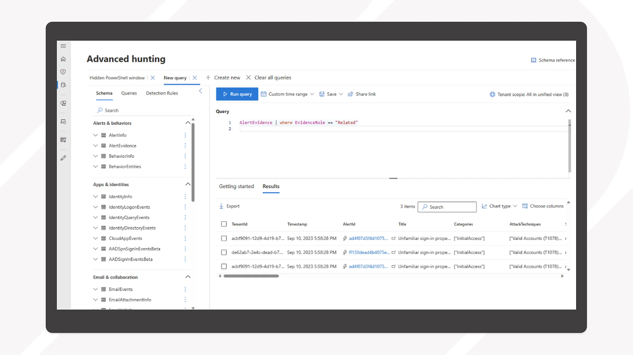 - **Proactively hunt for cyberthreats: **Hunt for cyberthreats across all workloads and uncover potential blind spots in your environment with a guided, step-by-step experience. Create custom queries to locate information across all XDR data.