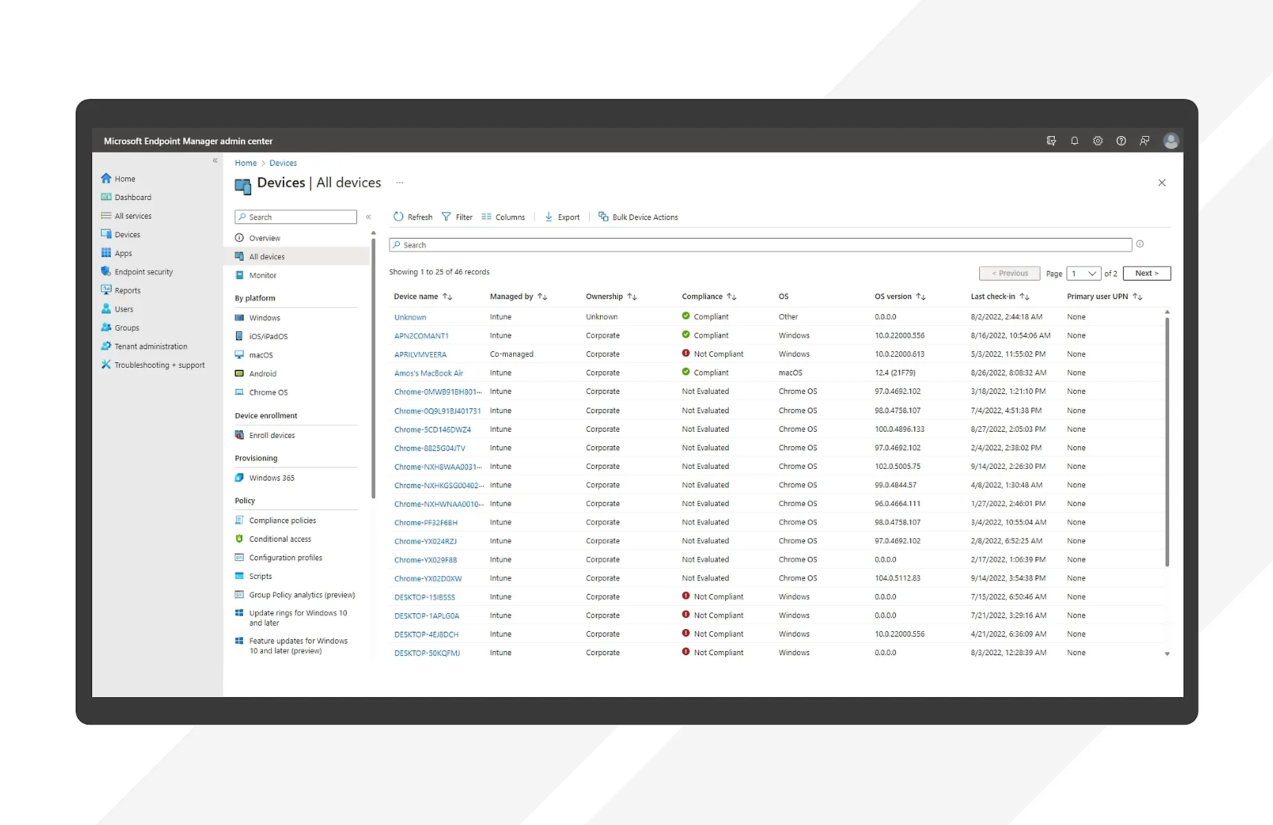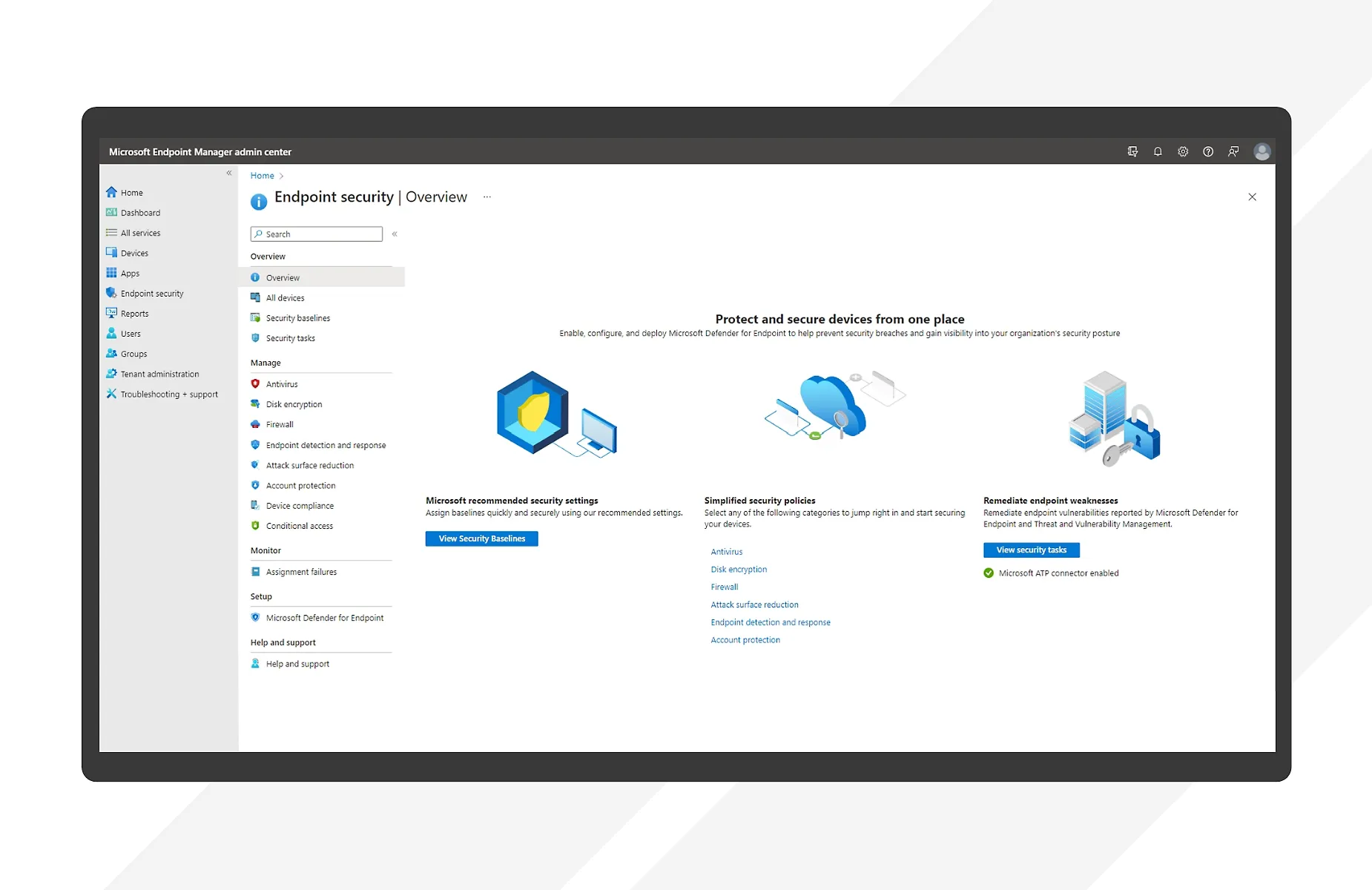 - **Simplify endpoint management: **Cut costs and complexity by managing any device with a single, unified tool already built into Microsoft 365. Gain full visibility into the health, compliance, and security status of your cloud and cloud-connected endpoints.