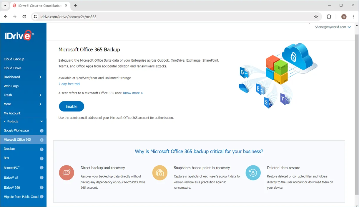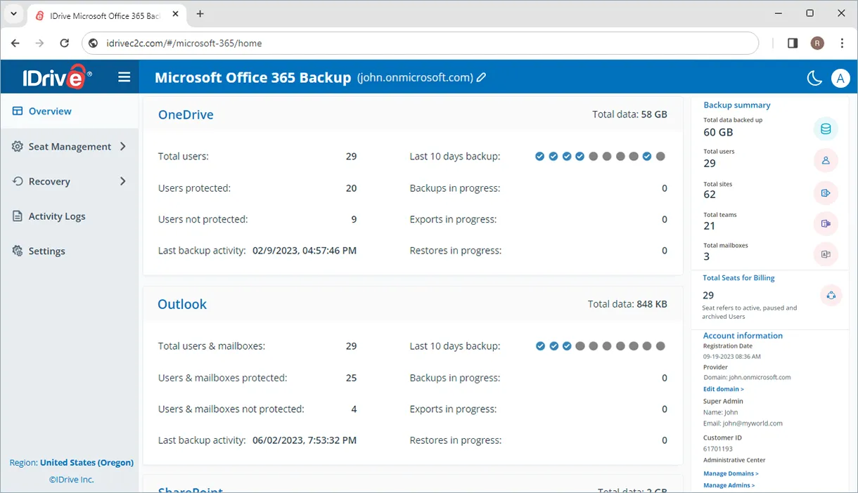 While many backup solutions offer only partial protection for Microsoft Office 365 data, IDrive goes further—securing your entire Microsoft Office Suite, including OneDrive, Outlook, Exchange, SharePoint, and Teams.