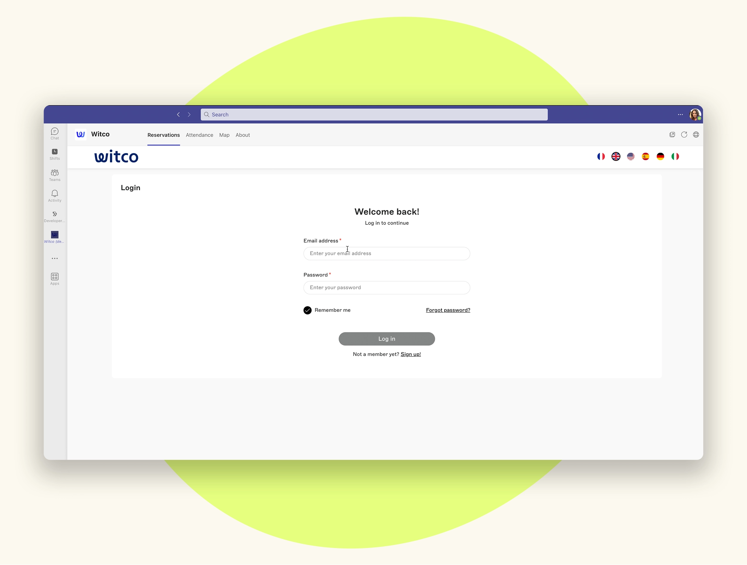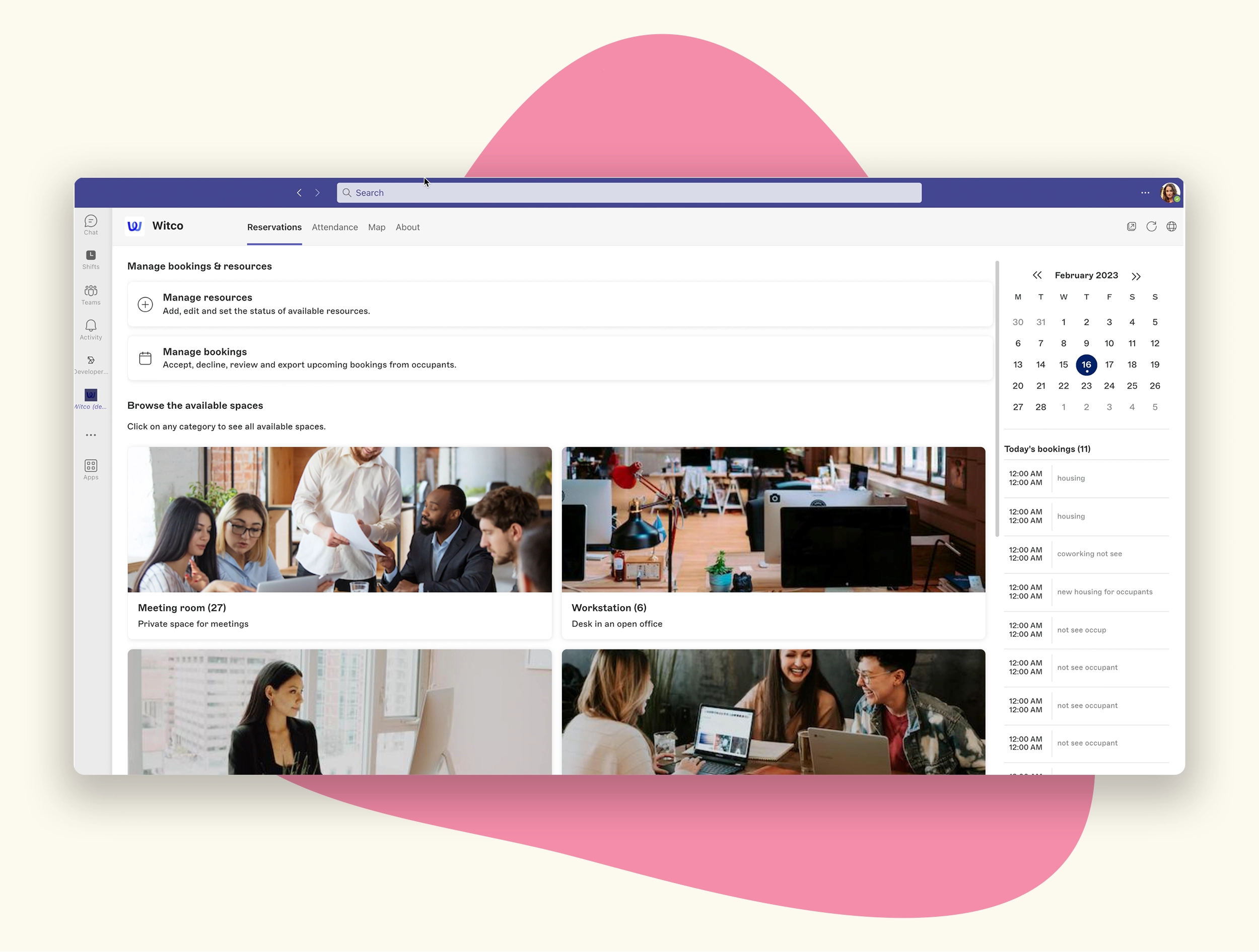 - Access Witco resource booking and reserve rooms or desks from the main tab in Teams.