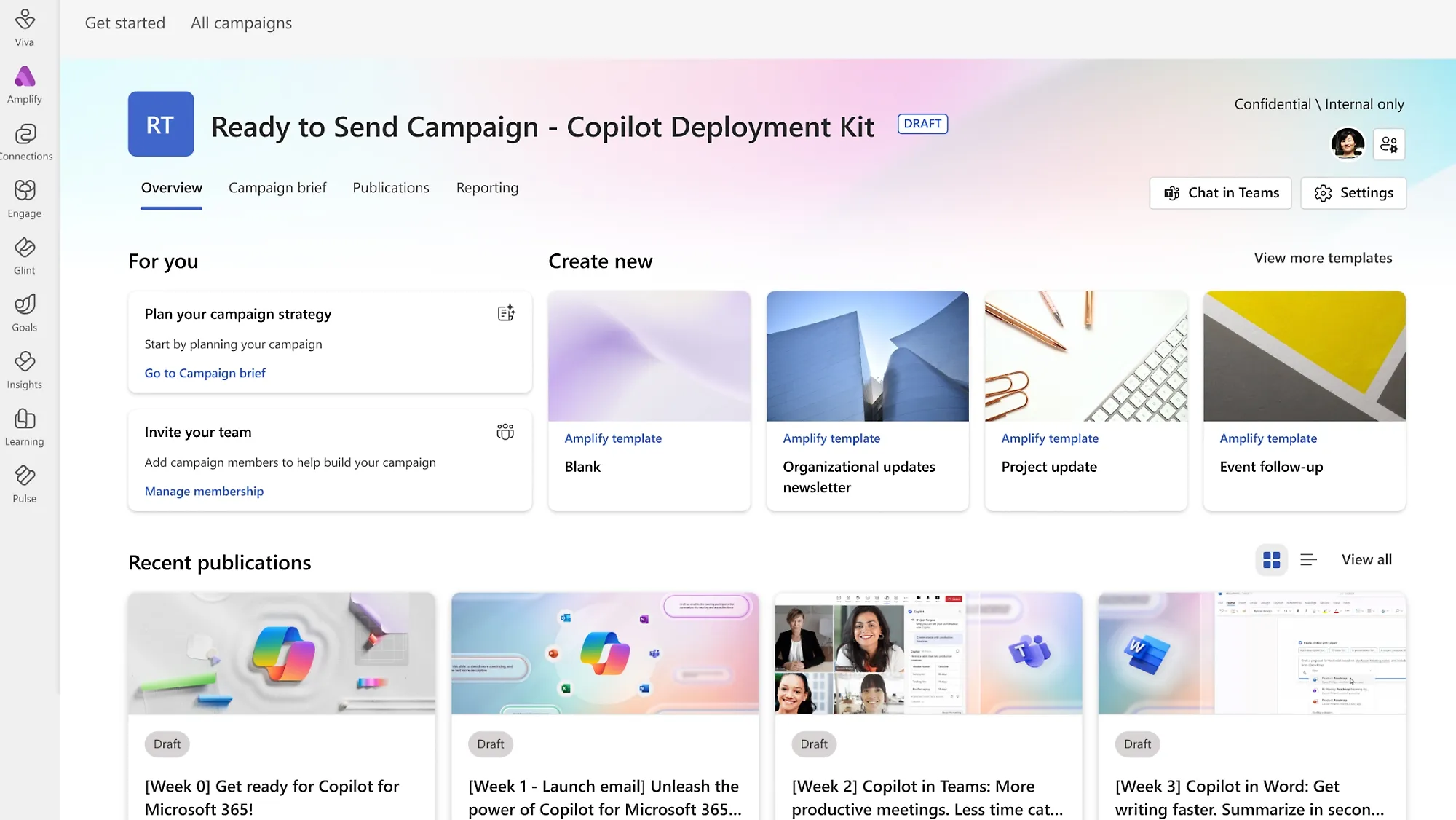 Viva Amplify is a centralized campaign management, publishing, and reporting app for corporate communicators to reach and engage all employees using multichannel publishing. Users can create publishing workflows, and track and measure analytics—all from one place.