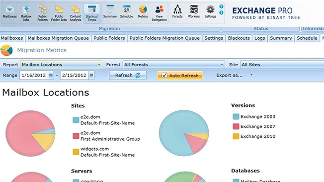 Quest's Migrator Pro for Exchange is a highly automated tool designed to streamline enterprise Exchange migrations to newer versions of Exchange, Microsoft 365, or GCC High. It facilitates the migration of mailboxes and public folders while automating administrative processes, providing end-users with visibility and control over their migration. The solution operates on Microsoft technologies like Windows Server, IIS, and .NET, and includes a SQL database and a PowerShell migration engine, resulting in rapid migrations to cloud, hybrid, or on-premises Exchange environments. Administrators can manage the entire project from a centralized console, automating data collection, scheduling, reporting, and user communication. Users have access to a self-service web portal to view migration schedules, subscribe to notifications, and select alternative migration dates, ensuring a seamless transition with minimal disruption.