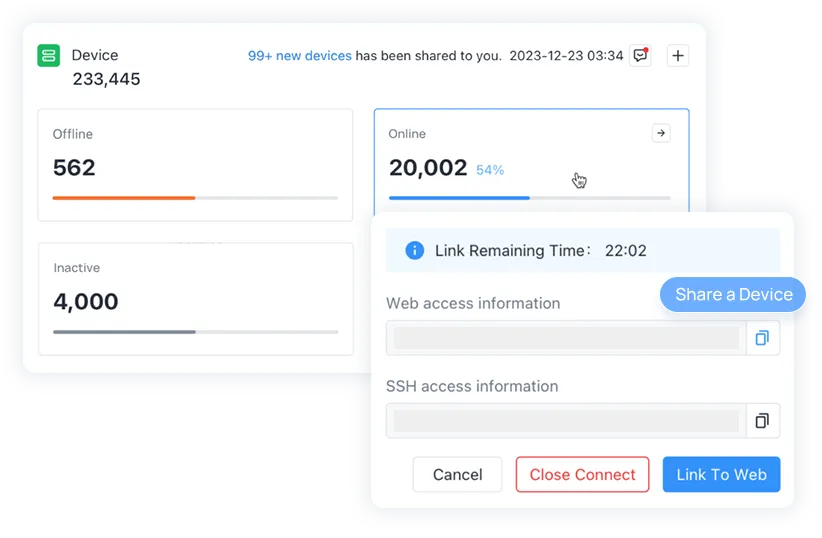Milesight Development Platform provides centralized device management with streamlined interactions with connected devices, batch operations for multi-device handling, a unified dashboard for data and events, and unified output capability for seamless data exchange with upper-layer application servers. Batch Operations Quickly add, delete, and edit multiple devices to save efforts. Remote Access Secure remote access for Internet-enabled devices via web and SSH Device Sharing Controlled access to specific devices for team and external collaboration. Over-the-air Updates Remotely deliver new settings and updated firmware to your Internet-enabled devices.