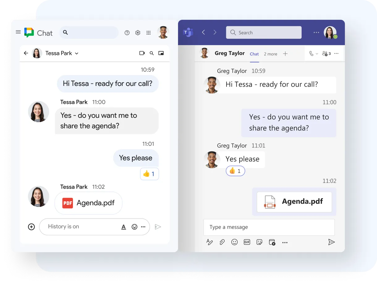- Cross-platform messaging between Google Chat and Microsoft Teams