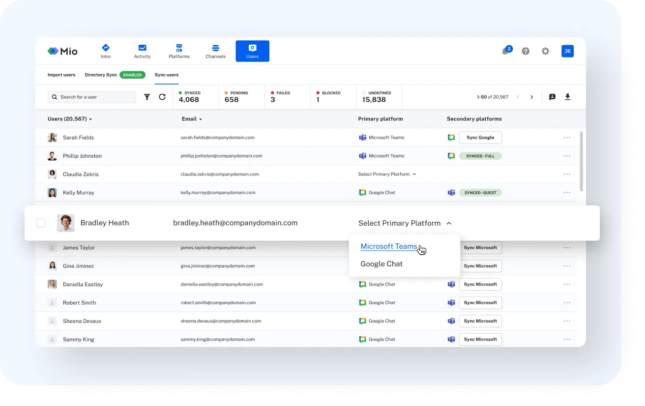 Mio Directory Sync is a bidirectional synchronization solution that mirrors user directories across Google Workspace and Microsoft 365. It ensures that every user in an organization is discoverable for seamless cross-platform communication. By automating user management through Microsoft Entra ID groups, Mio simplifies collaboration across email, calendar, file sharing, and chat, enabling unified communication without requiring users to switch platforms.