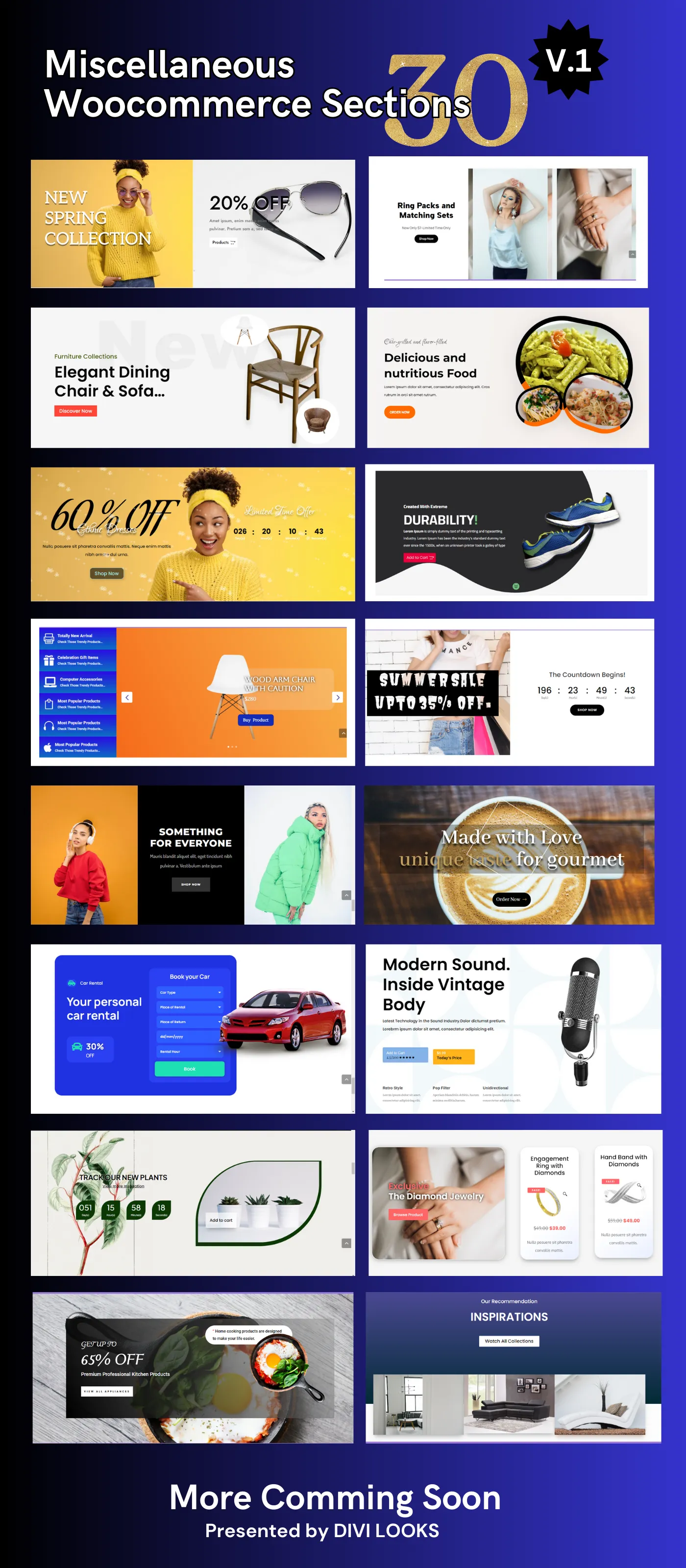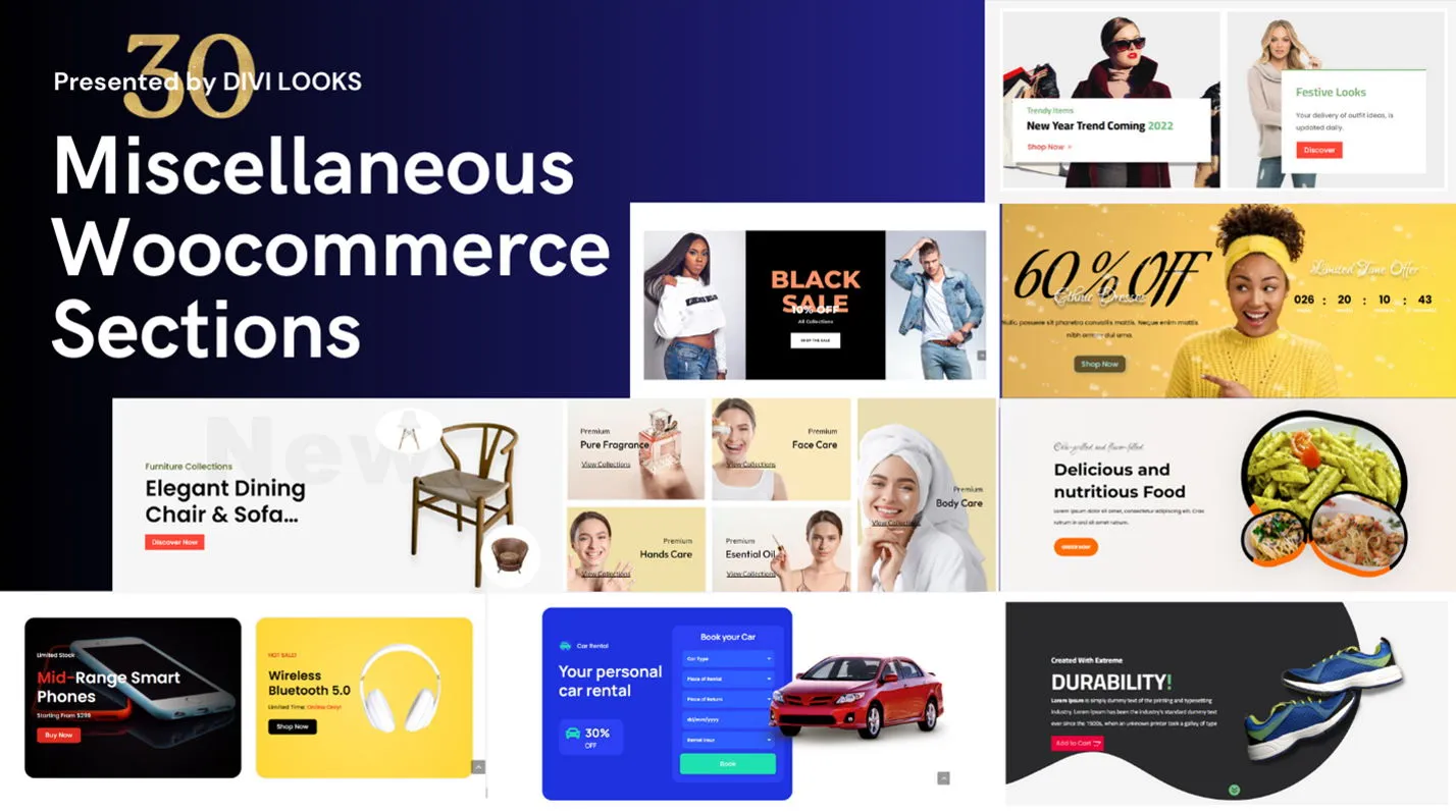 Creative WooCommerce section layouts for Divi, ideal for enhancing product pages, hero areas, and shop visuals.