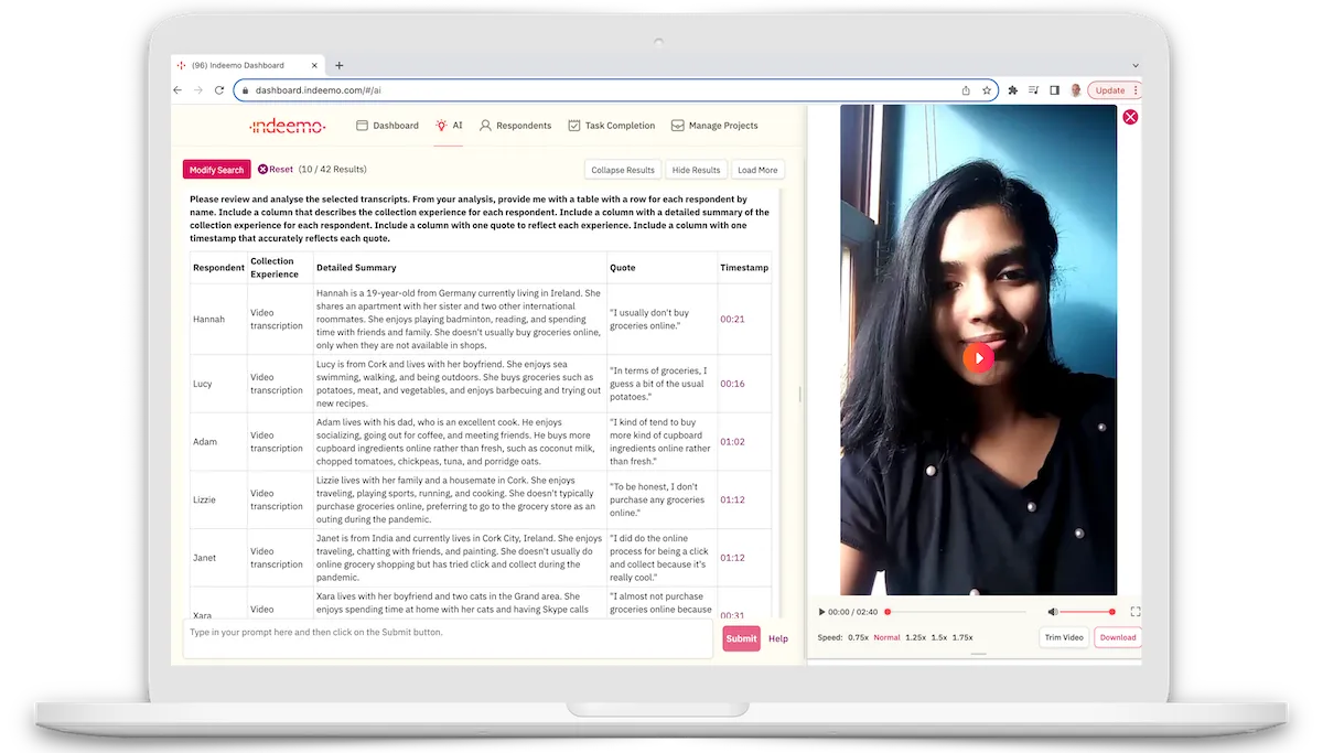 Indeemo is an AI-powered mobile ethnography platform that enables researchers, designers, and insights teams to remotely capture authentic, in-context multimedia content from participants using their smartphones. Through tasks and diary studies, respondents upload video, photo, screen recordings, or text from everyday life. This media is instantly visible to researchers via a dashboard—creating cost-effective, scalable remote qualitative research with enterprise-grade security.