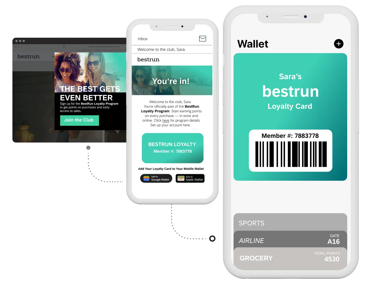 Send your customer a loyalty pass that they can add directly to their mobile wallet, allowing for easy and convenient in-store identification, richer customer insights, and frictionless customer experiences.