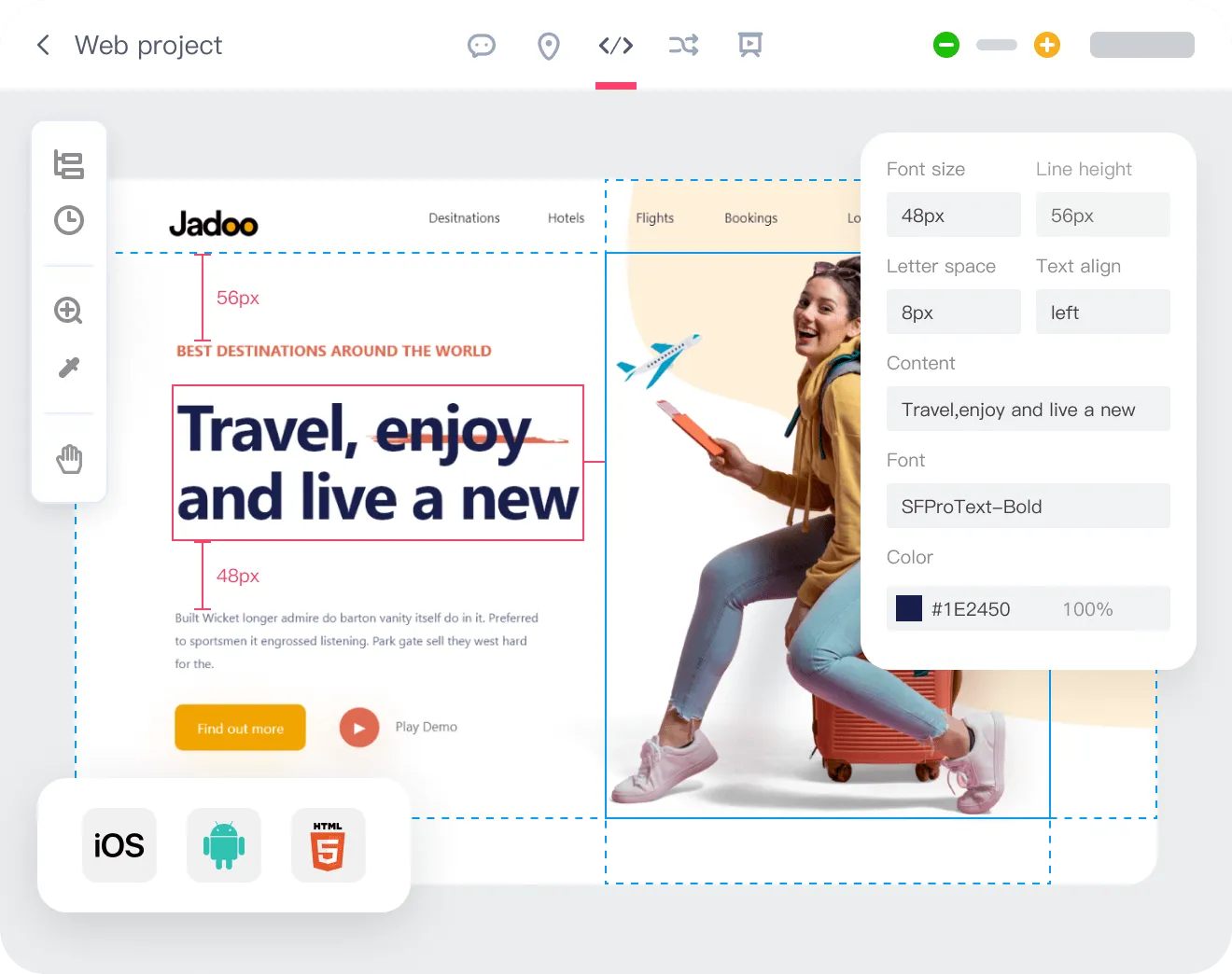 Never write any delivery docs manually from scratch again! With Mockplus Cloud, design specs, measurements, redlines, assets, and code snippets are auto-generated for all platforms like Web, iOS, and Android. They are easy to inspect and ready for export.