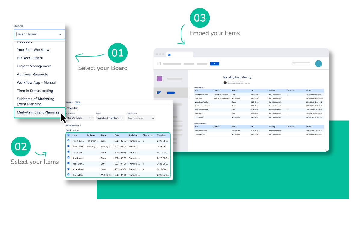 - Allows embedding specific monday.com items into Confluence without requiring an embed link or navigating to monday.com, provided correct permissions.