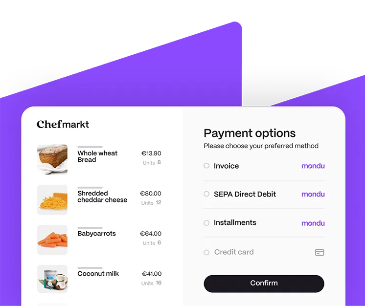 Mondu Installments enables business buyers to split purchases into monthly payments over 3, 6, or 12 months. Merchants receive full upfront payment while Mondu handles credit checks, fraud prevention, and collections, offering a seamless and risk-free way to increase conversion and average order value.