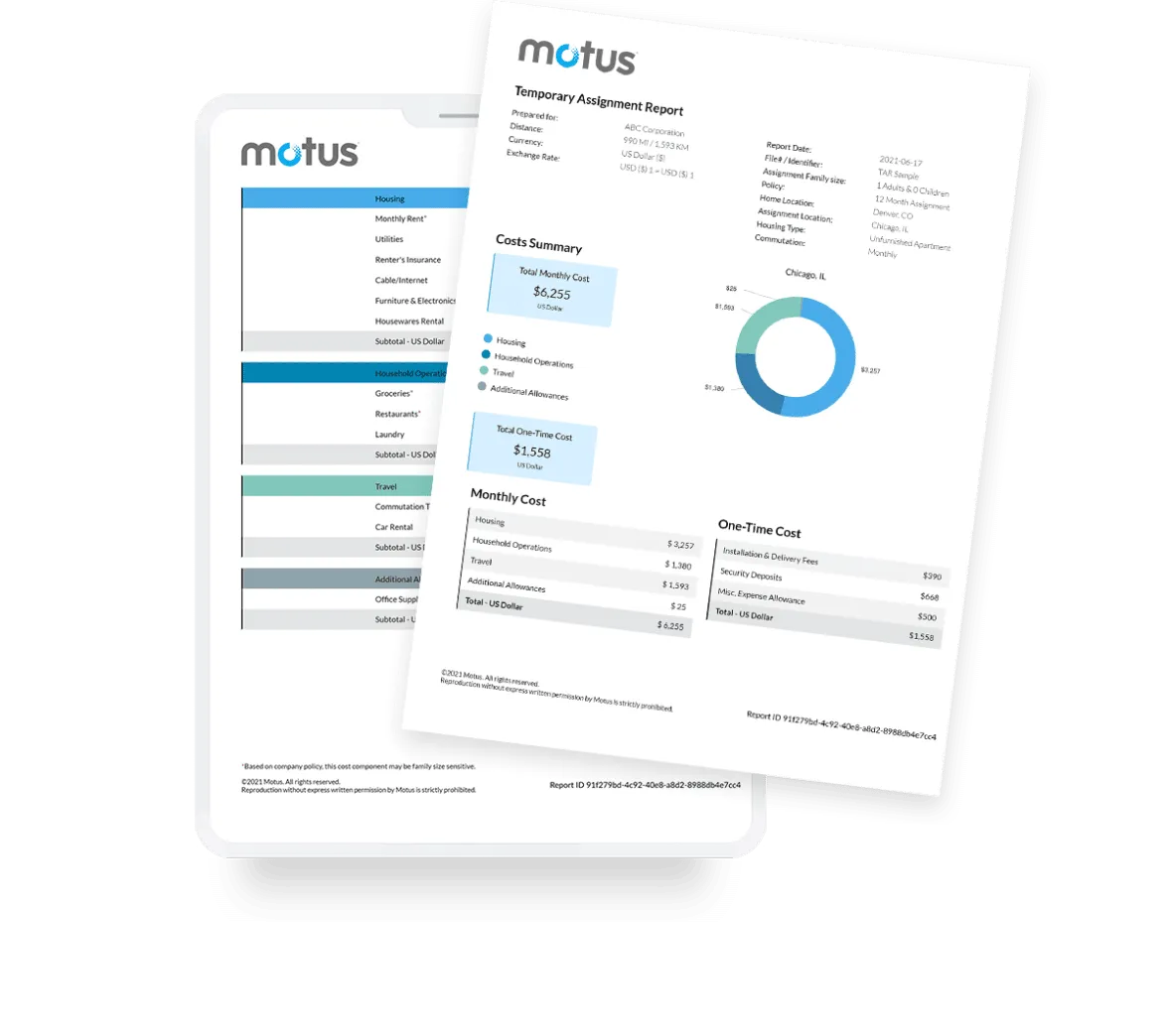 Employees moving away from a corporate or home office to live and work temporarily in a different location often need support. Calculate Allowances To reimburse temporary assignment employees, companies can provide a package that reflects the circumstances of their arrangement. Any Destination For U.S. and Canadian destinations, Motus Temporary Assignment Reports can be set up to cover various costs, including furniture rental and installation fees. Comprehensive Data To offer the right allowance, we collect data on: worksite location, housing costs, food, transportation, one-time expenses and length of assignment.