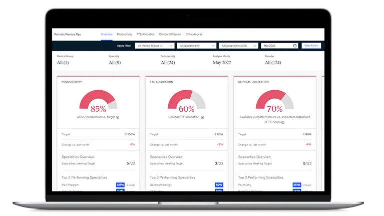- Provides granular insights into productivity, full-time equivalent allocations, and patient access by specialty, sub-specialty, and individual physicians over time