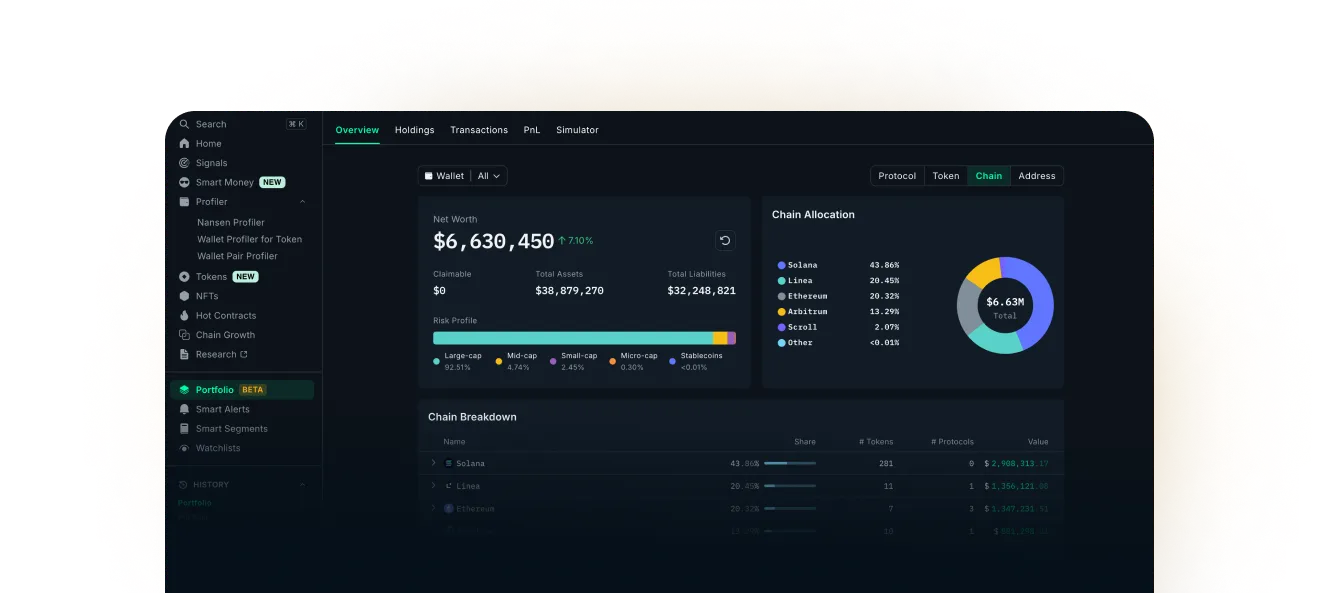 Track crypto assets, wallets, and transactions across 17 chains and 100+ protocols in one powerful dashboard with Nansen Portfolio Tracker.