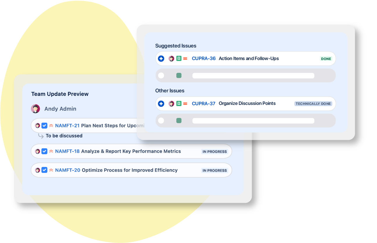 - Links tasks and topics directly to Jira, ensuring meeting outcomes are actionable and easily tracked. Also allows adding comments, logging updates, and creating tasks directly from meeting notes.
