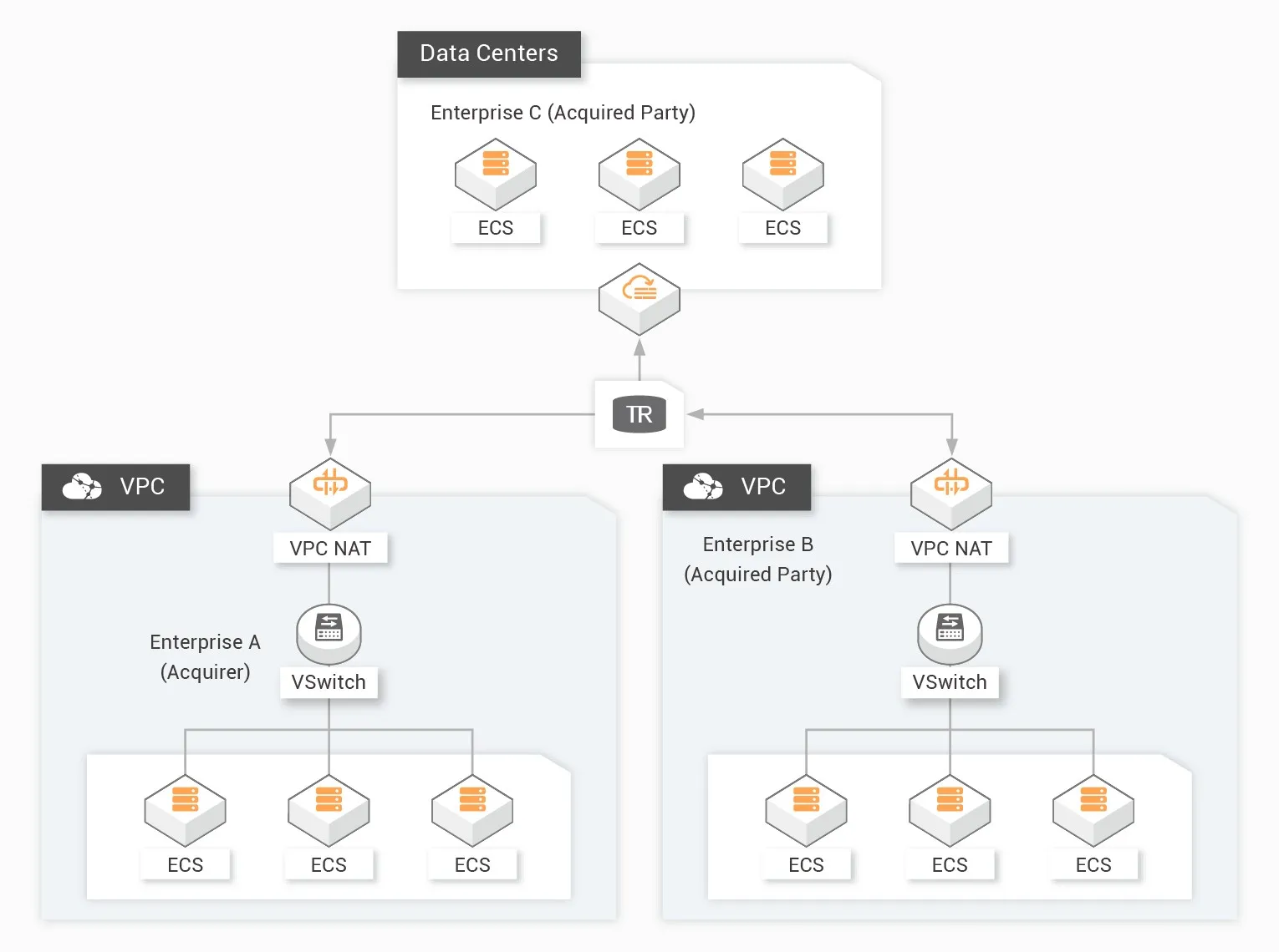 Flexible SNAT and DNAT management allows you to implement access between private networks with specified IP addresses. This effectively resolves the IP address conflicts between private networks and implements secure isolation. SNAT SNAT allows multiple ECS instances in a VPC to use the same private IP address to access private networks. This hides the actual IP addresses of the ECS instances, prevents IP address conflicts, and reduces the risk of direct server attacks. DNAT DNAT allows you to open specified ports on instances in a VPC to a connected network. Instances can use the specified private IP address to provide services. Custom Address Translation You can flexibly manage the private IP addresses for mutual access to meet the business requirements for mutual access with specified IP addresses.