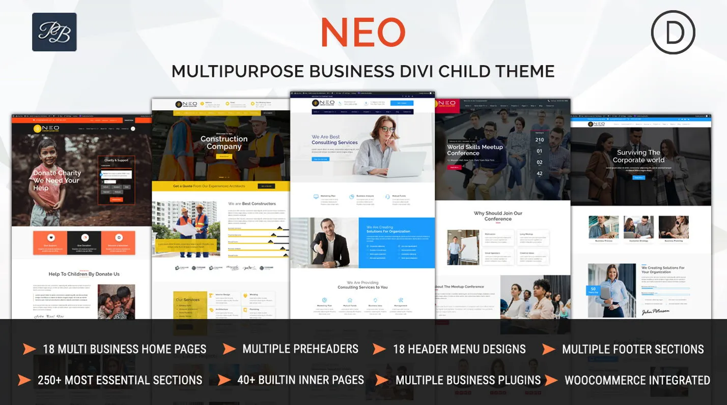 Neo Multipurpose Business Divi Child Theme suitable for all kind of business categories corporate, business, finance, fashion, construction, education, industry, factory medical, travel, roofing & flooring, e-commerce, shopping and general purpose.