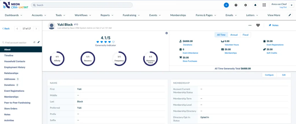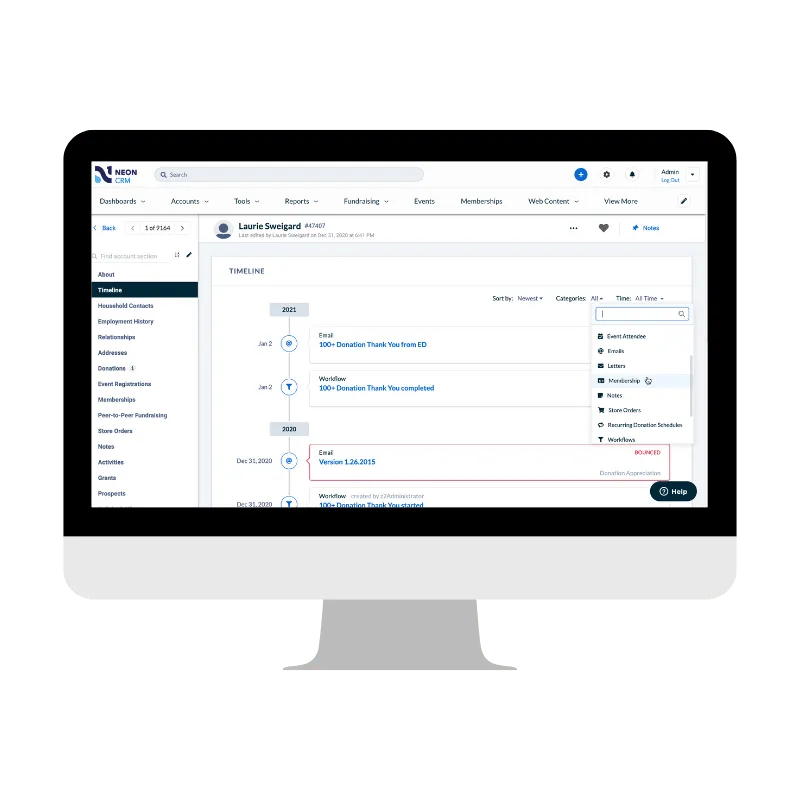 - Donor & Member Database: Comprehensive 360° view of supporters including donations, membership levels, activities, volunteer participation, renewal history.