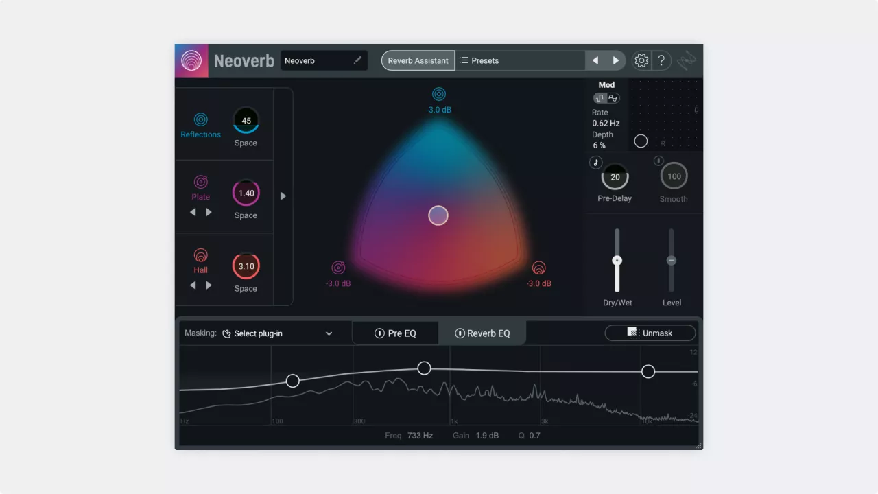 Neoverb's AI-powered EQs listen to your audio to make suggestions. Unmasking technology helps your reverb stand out in the crowd, or blend into the mix.