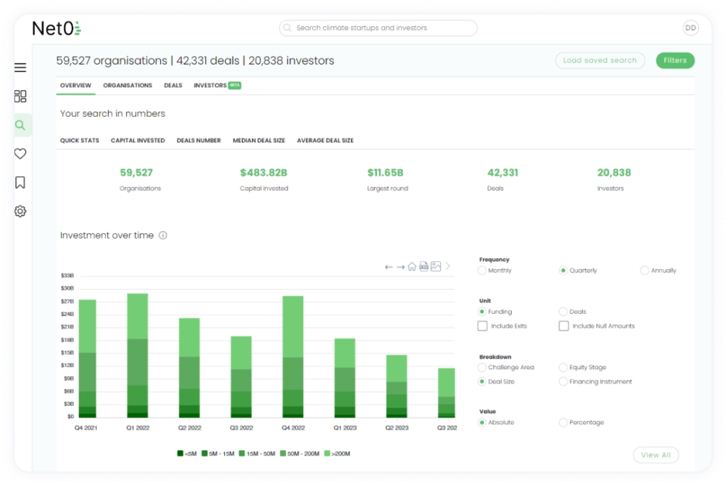 Access the most comprehensive climate tech dataset. Navigate the global market with ease, filtering by industry, investment type, or stage. Track startups from pre-seed to exit.