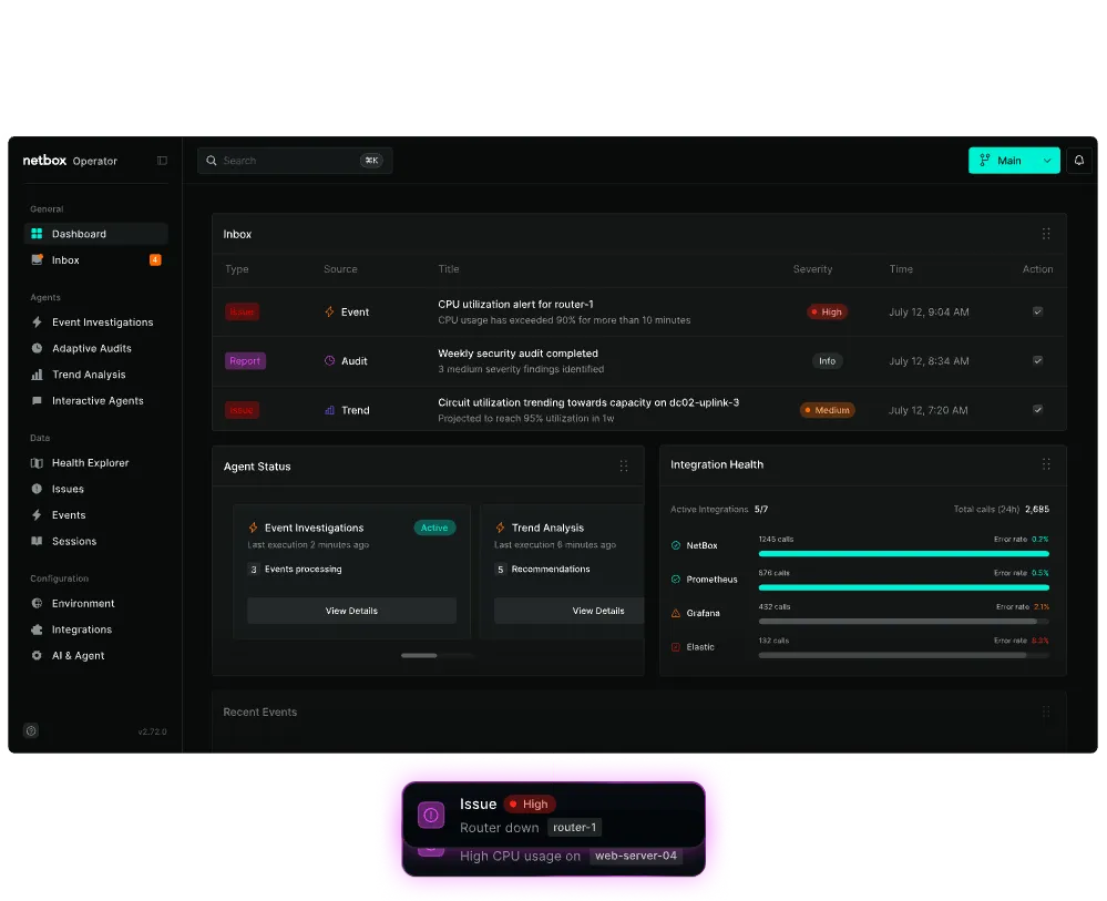 NetBox Operator is an AI-driven network and infrastructure operations platform that leverages NetBox’s semantic model to automate monitoring, triage, and remediation. Designed to eliminate operational toil, it delivers always-on insight, lightning-fast incident resolution, and intelligent workflows. Operator integrates with your existing tools and is powered by Nitro AI, enabling proactive, context-aware infrastructure management.