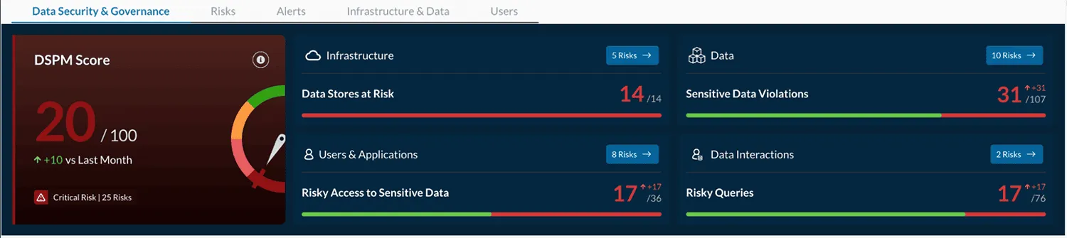 DSPM Score and risk indicators provide instant insights into your data security posture, highlighting critical risks across data stores, user access, and interactions.