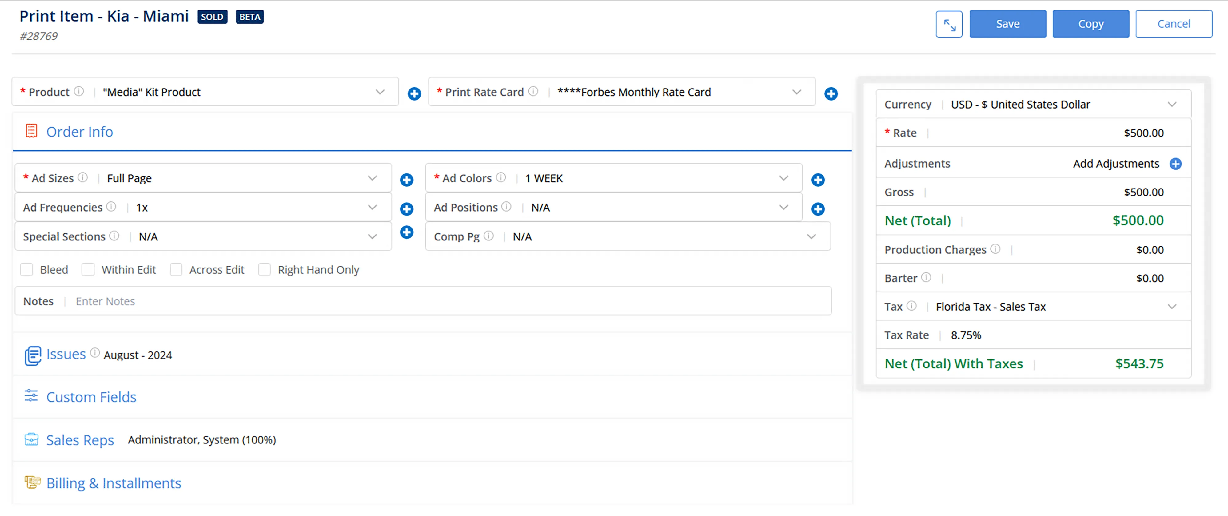 - Ad Order Entry System: Supports creation of proposals that convert into contracts, insertion orders and invoices; handles print and digital ad buys, allows editing of ad size, positioning, frequency and pick-up instructions.
