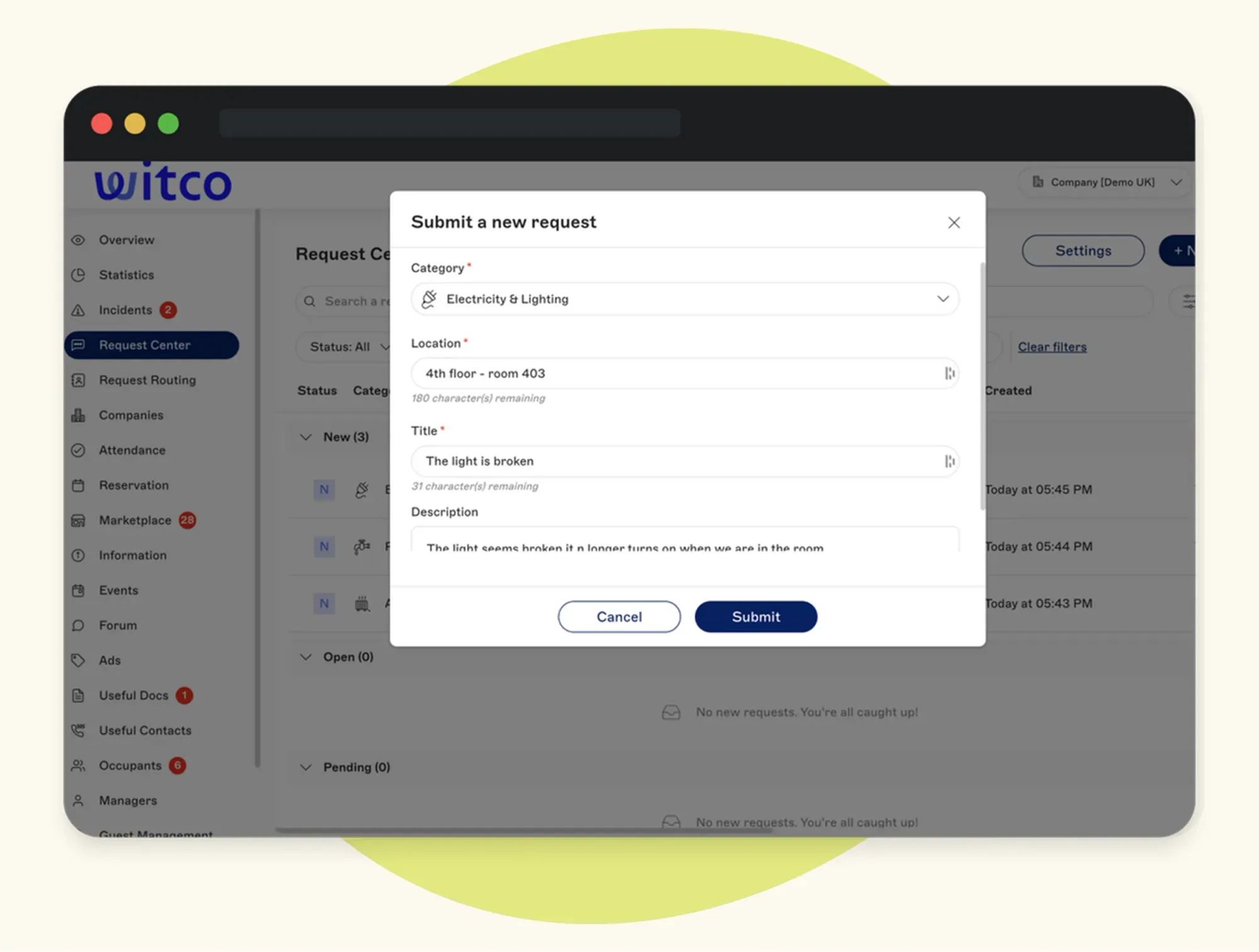 Nouvel Atrium by Veolys is a facilities management web platform that centralizes building services, maintenance, monitoring, audits, meter tracking, inventory, and a mobile app, aimed at optimizing exchanges among occupants, FM teams, and owners. When integrated via the Witco Marketplace, it streamlines information flow and digitizes request handling and operations across the real-estate portfolio, providing a single interface for occupants while FM teams operate detailed workflows in Nouvel Atrium.