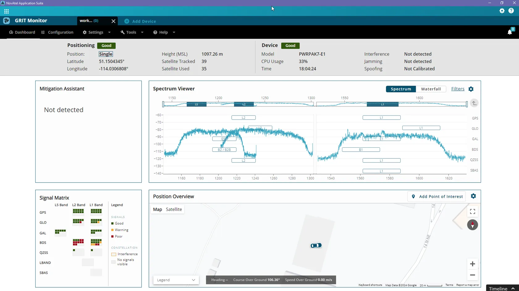 - Real-time monitoring of device status including positioning, satellite tracking, L-band corrections, and firmware solutions like SPAN GNSS+INS and PPP.