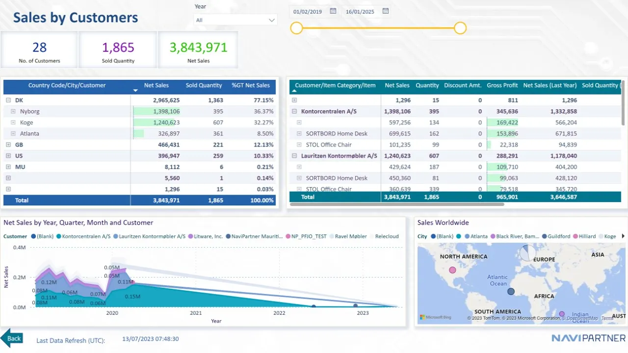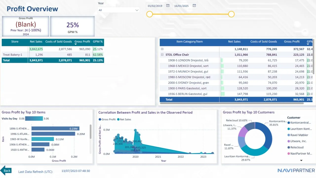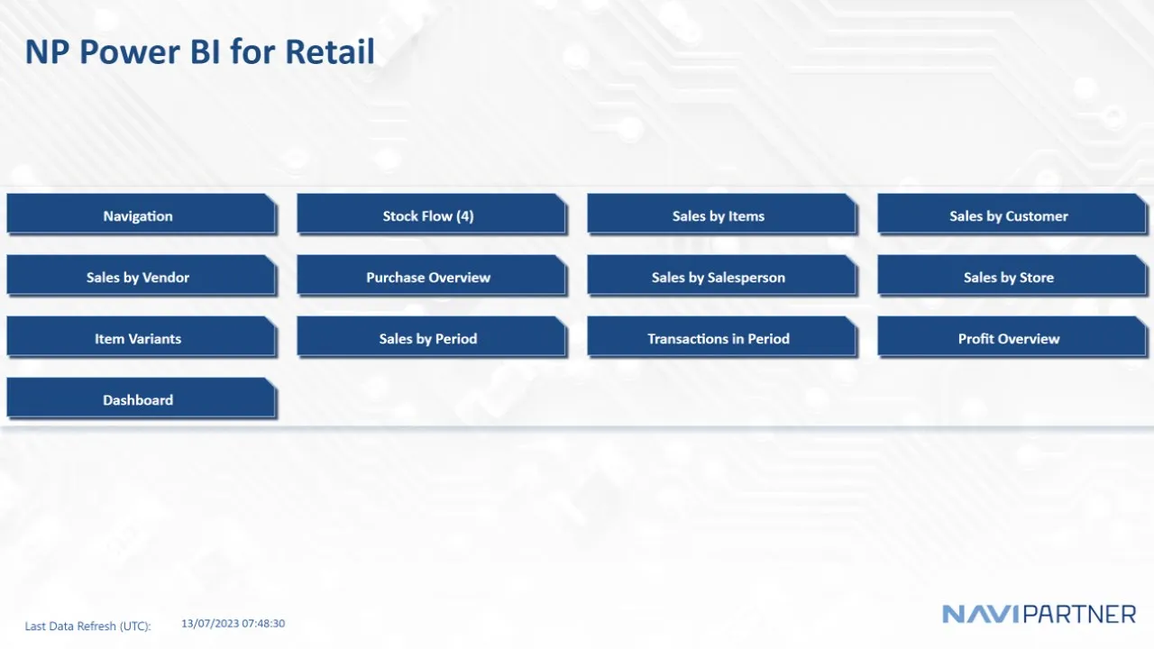 NP Power BI for Retail is a Power BI report designed to provide comprehensive analysis for retail businesses, particularly those using Microsoft Dynamics 365 Business Central SaaS. It offers in-depth insights into sales, costs, and profit, enabling users to stay ahead of the competition. The report includes dedicated pages for analyzing stock flow (quantity and amount), movement per location, and stocks per vendor, allowing for detailed examination of inventory changes over specific periods. It also provides detailed sales reports categorized by items, customers, prime vendors, salespeople, stores, and item variants. A purchase overview report helps understand purchasing patterns from prime vendors, grouped by item categories and items. Sales performance is visualized across various time intervals, including years, quarters, months, weekdays, and hours. Transactional data is leveraged to provide overviews per document and entry types, along with average invoice amounts. A profit overview and a dashboard consolidate these insights for a holistic business progress view. The reports utilize hierarchies for detailed and summarized overviews, drawing data primarily from the Value Entry transactional table.