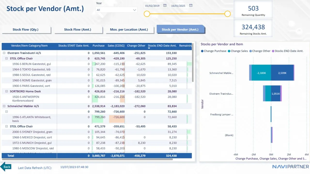 - Stock Flow Analysis: Four pages dedicated to analyzing inventory quantity, amount, movement per location, and stocks per vendor.