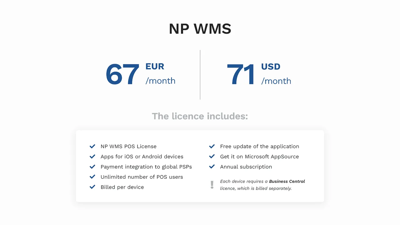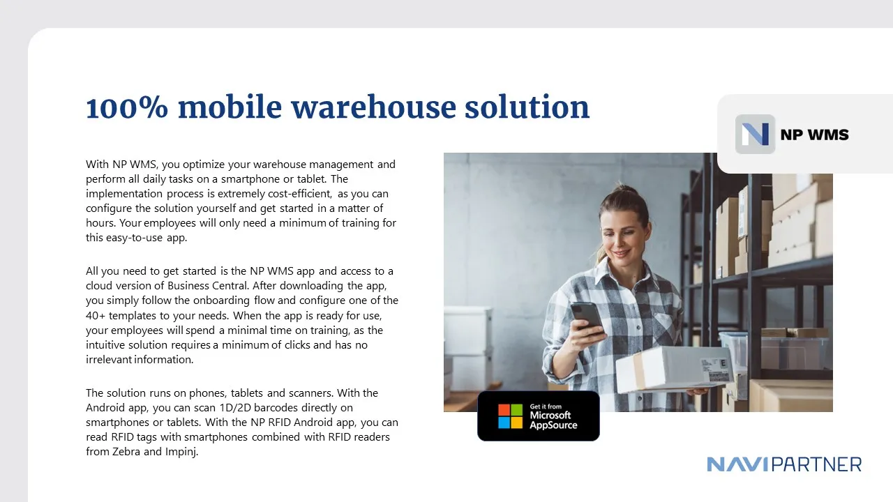 NP WMS is a mobile warehouse management system designed for Microsoft Dynamics 365 Business Central, aiming to increase revenue and decrease costs for businesses. It offers a quick installation process, with an onboarding flow and over 40 customizable templates for warehouse management. The system enhances employee efficiency through a user-friendly interface that minimizes errors and training needs. Real-time inventory data is provided via cloud data exchange, ensuring a 100% updated overview. The embedded RFID technology allows for precise and frequent inventory counts. NP WMS is built directly within Dynamics 365 Business Central, eliminating the need for external integrations. The mobile apps for Android support barcode scanning on smartphones and tablets without external hardware, and also integrate with Honeywell and Zebra devices. For RFID reading, the NP RFID app for Android works with Zebra and Impinj scanner hardware. Key warehouse management features include receiving, put away, picking, moving (planned, unplanned, and bulk), counting (planned and unscheduled), quantity adjustments, location content lookup, item referencing, and the ability to attach images to workflows or create product images using smartphone cameras.