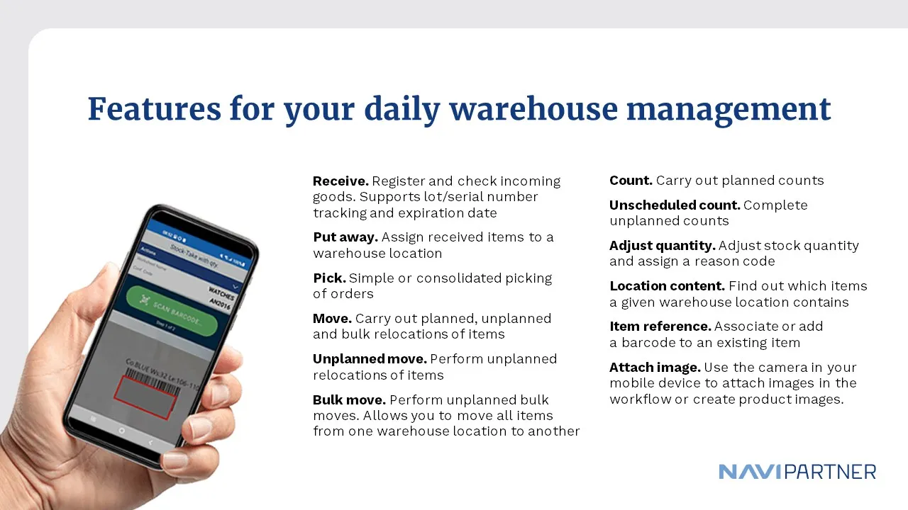 A mobile warehouse management system for Dynamics 365 Business Central, optimizing operations with RFID and barcode scanning.