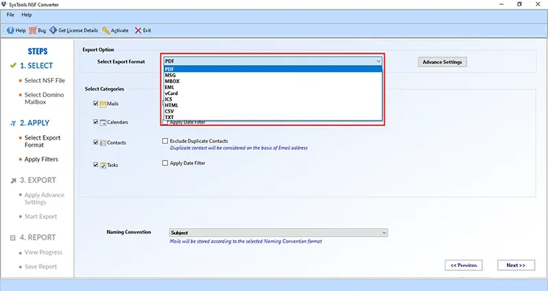 - Convert NSF files to MSG, MBOX, EML, EMLX, PDF, vCard, ICS, HTML, CSV, TXT, DOC, and DOCX.