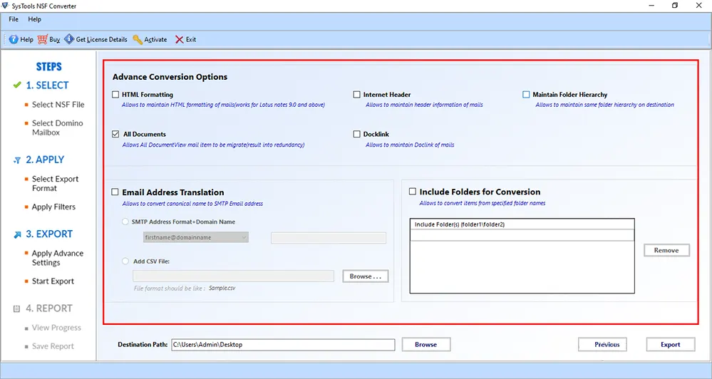 - Date filter option for selective conversion of NSF files.