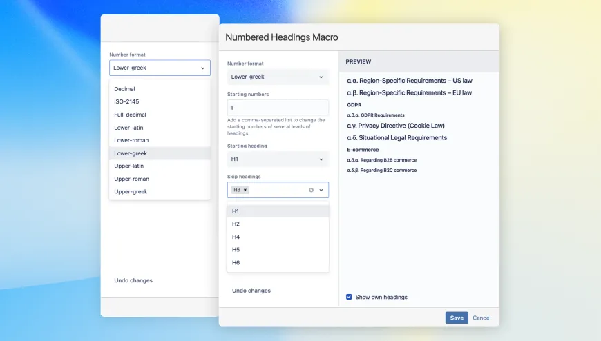 With Numbered Headings you can save time and reduce the effort to number your headings manually by automatically numbering them. The app allows teams to automatically number their headings and subheadings in pages or entire spaces. In addition to providing more ways to number headings (page, macro, and space), it also provides a variety of numbering formats for users to choose from. You can also: