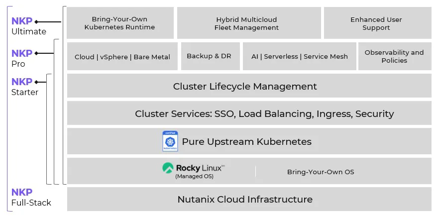 Pure upstream Kubernetes NKP is built on pure upstream CNCF-conformant Kubernetes. That means so you can leverage the innovation of the open-source community while avoiding the pitfalls of forked Kubernetes versions and dependencies. Multi-cluster platform lifecycle management Complete management lifecycle of clusters through the central management plane enables you to standardize on a highly resilient and secure stack on any infrastructure – cloud, bare metal, edge, or air-gapped. Military-grade security NKP exceeds NSA/CISA Kubernetes security hardening guidelines and can be configured to meet defined security standards. Each component is scanned for vulnerabilities before release. NKP also simplifies full air-gapped deployments via self-contained images and purpose-built automation.
