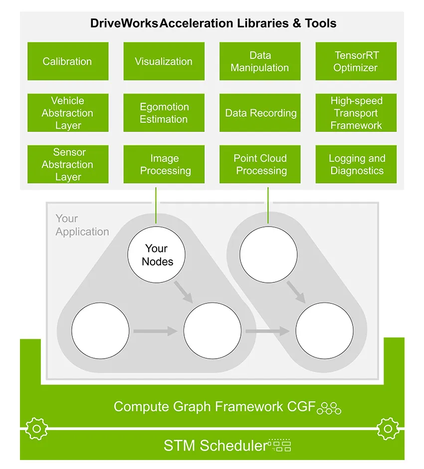 - Compute Graph Framework (CGF) and STM Scheduler: Express applications as nodes of a directed acyclic graph (DAG) with fine-grained control over compute resource consumption. The STM scheduler ensures efficient, non-preemptive scheduling for safety-critical applications.