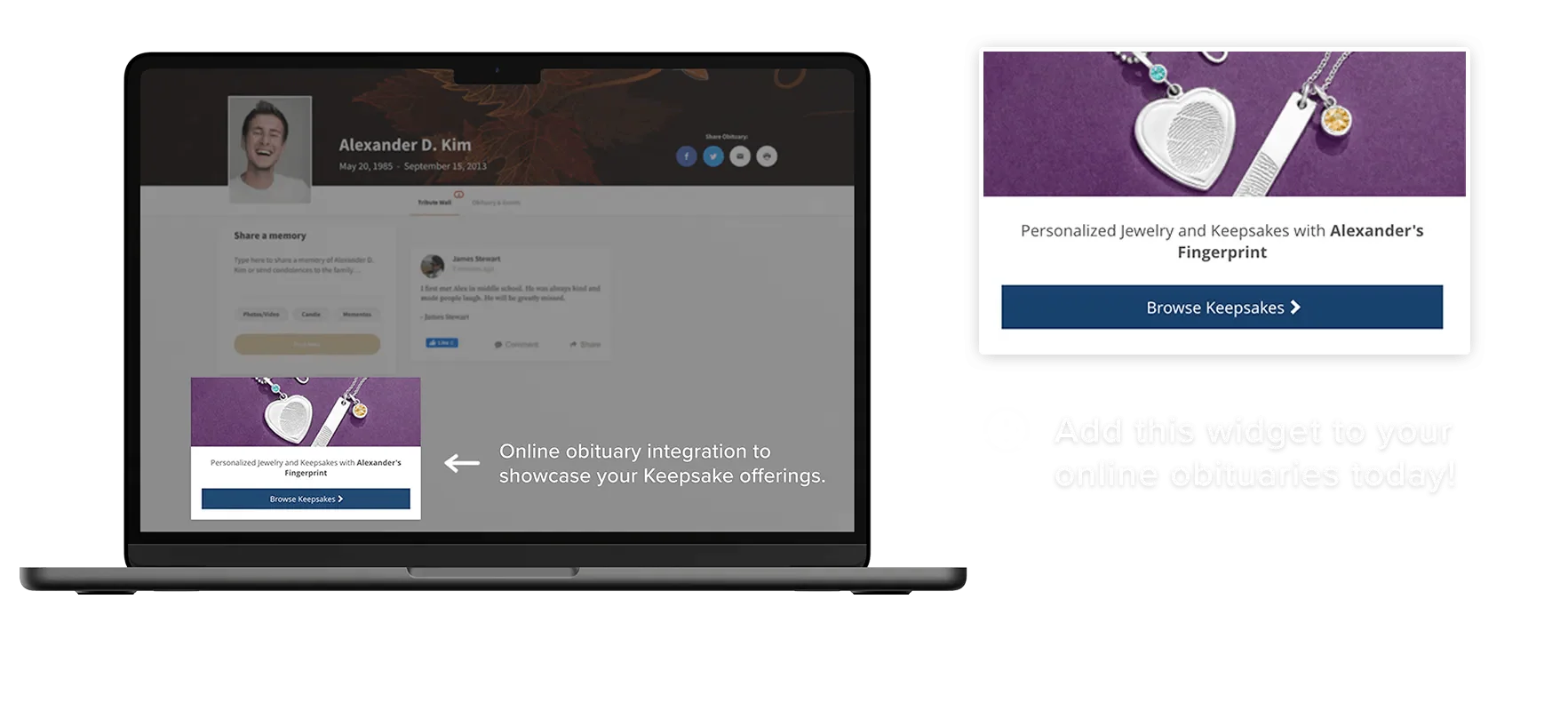 Legacy Touch Obituary Integration is a specialized solution that connects funeral home websites with Legacy Touch’s personalized keepsake ordering system. It enables families to purchase fingerprint jewelry and memorial items directly from online obituaries, creating a seamless experience that combines remembrance with convenience.