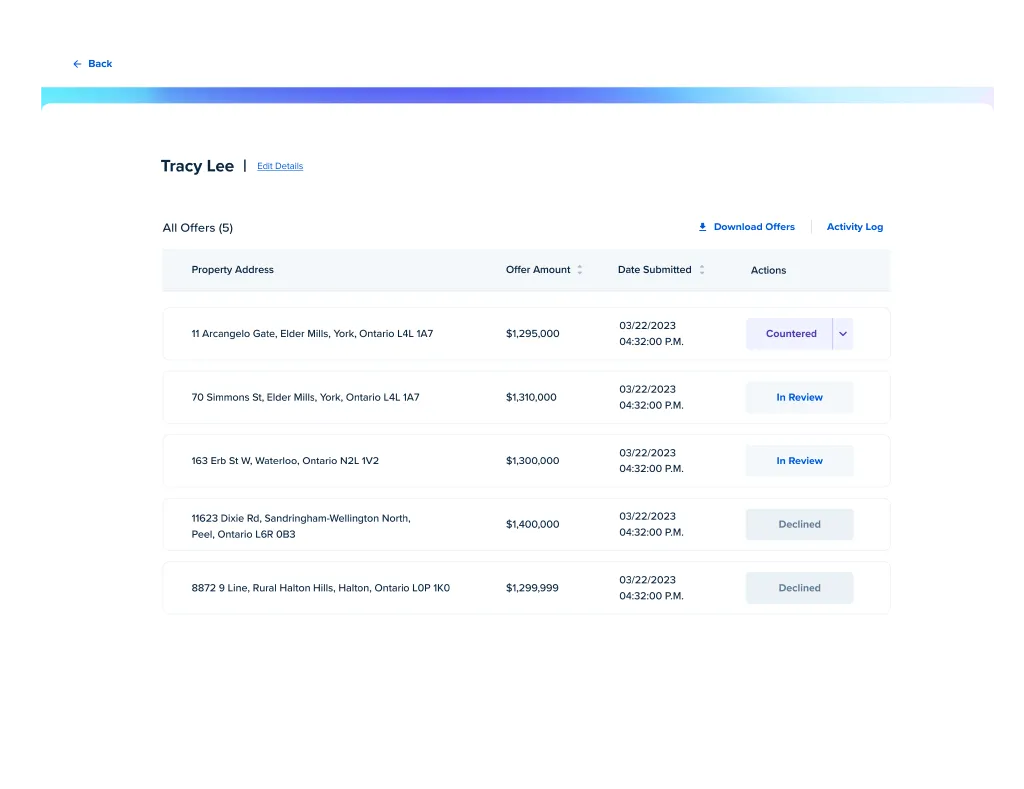 - **View real-time offer status: **Build trust with clients and keep track of submitted offers with real-time notifications when an offer is viewed, countered, declined, or accepted.