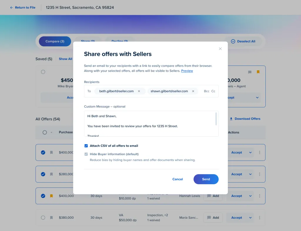 - Removing Bias: Buyer details — including buyer names — are obscured during the offer evaluation process to prevent the potential for bias.