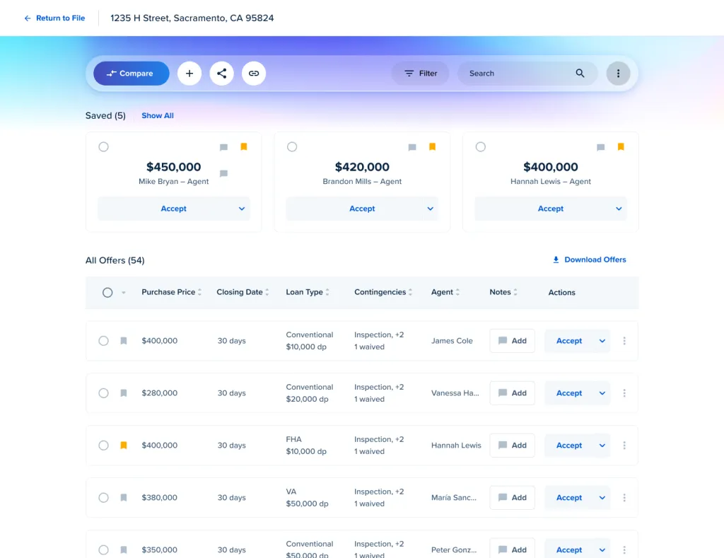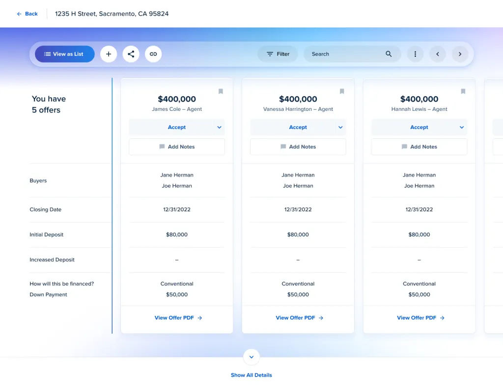 - At-a-glance data: Every offer is displayed, sorted, and compared by multiple data points, including price, closing period, contingencies, and more.