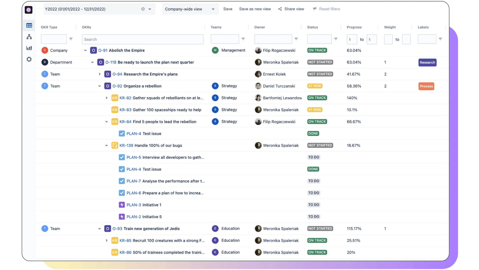 From 2 to 2,000, OKR for Jira works for any size team. Create objectives, add key results, and connect them to relevant Jira issues.