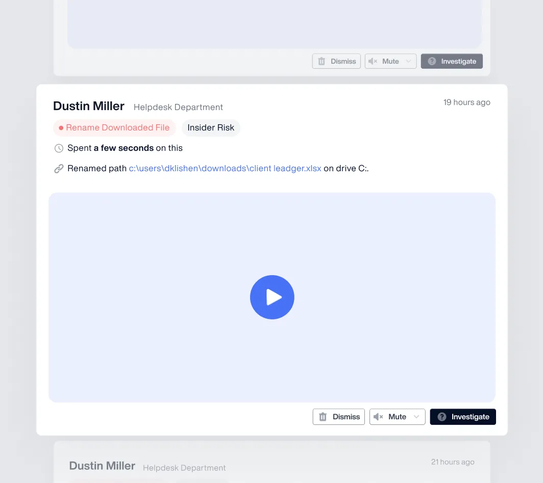 - User Activity Recording: Captures screen video, keystrokes, emails, chats, and file transfers for forensic analysis and incident investigations.