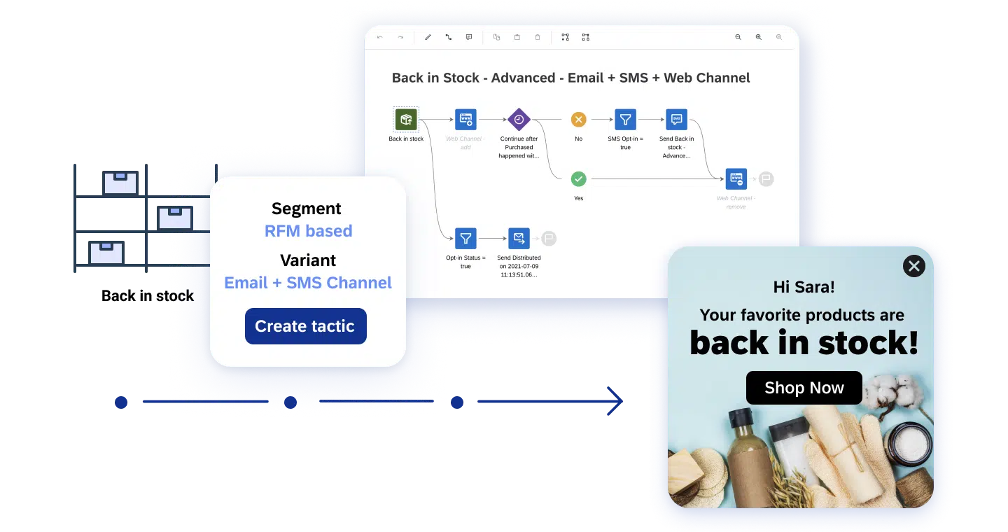 Create and execute personalized campaigns that increase engagement, drive repeat purchases, and grow customer loyalty. SAP Emarsys gives consumer products marketers the power to build sophisticated and scalable cross-channel customer journeys that span the entire customer lifecycle, from initial interactions to post-purchase experiences and beyond.
