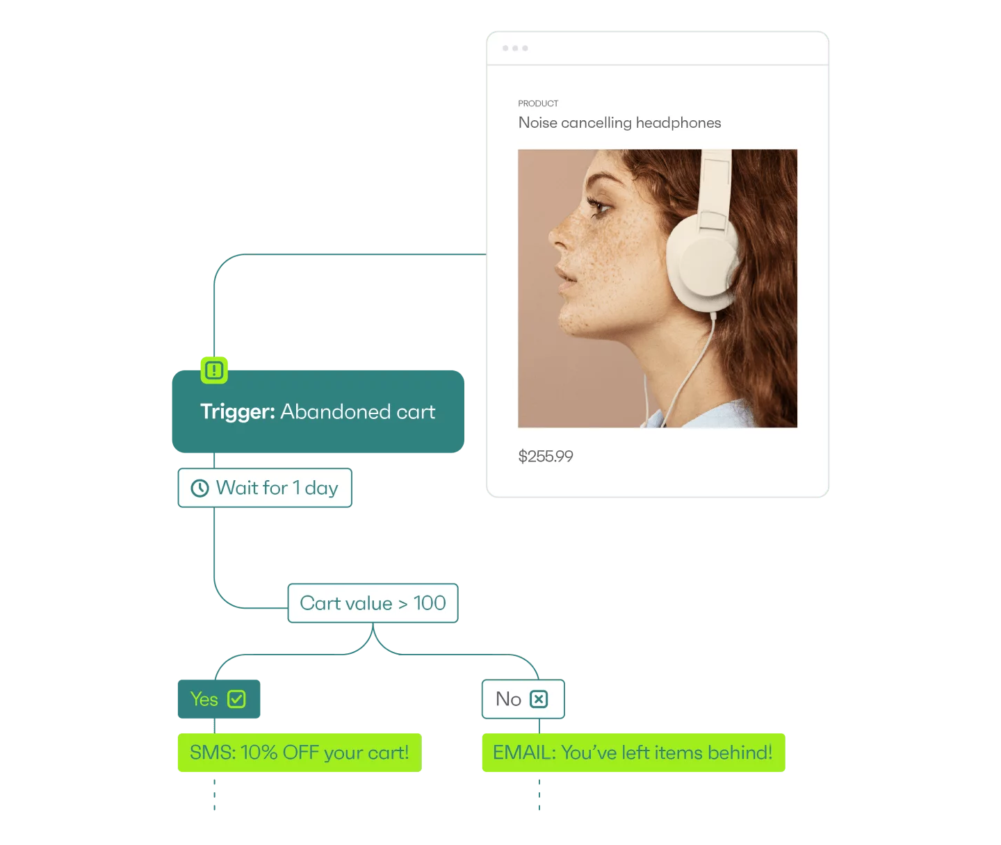 - Prebuilt workflows for cart abandonment, post-purchase, win-backs, and more across email, SMS, and push channels.