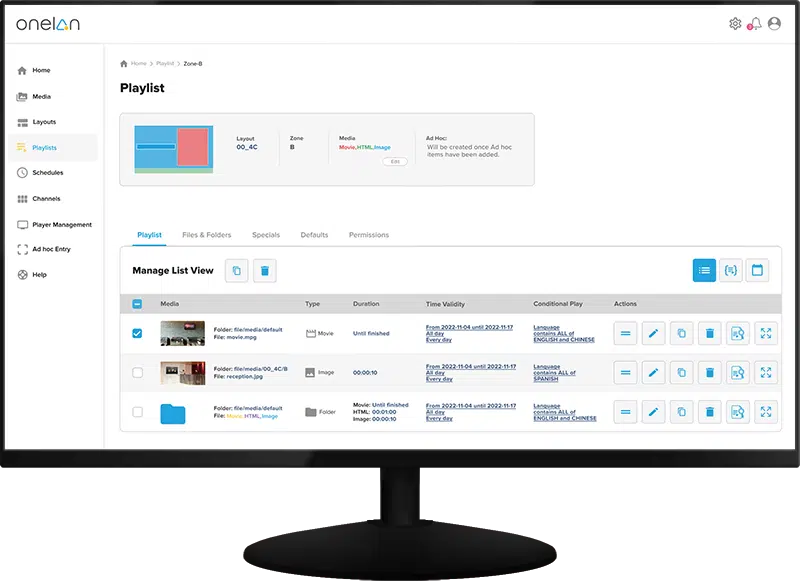 Onelan Digital Signage CMS includes drag and drop layout editors, event triggers for single and multiple dynamic screen change, playlist creators as well as full reporting and analytics tools so you can see exactly what was played when and on what end devices.