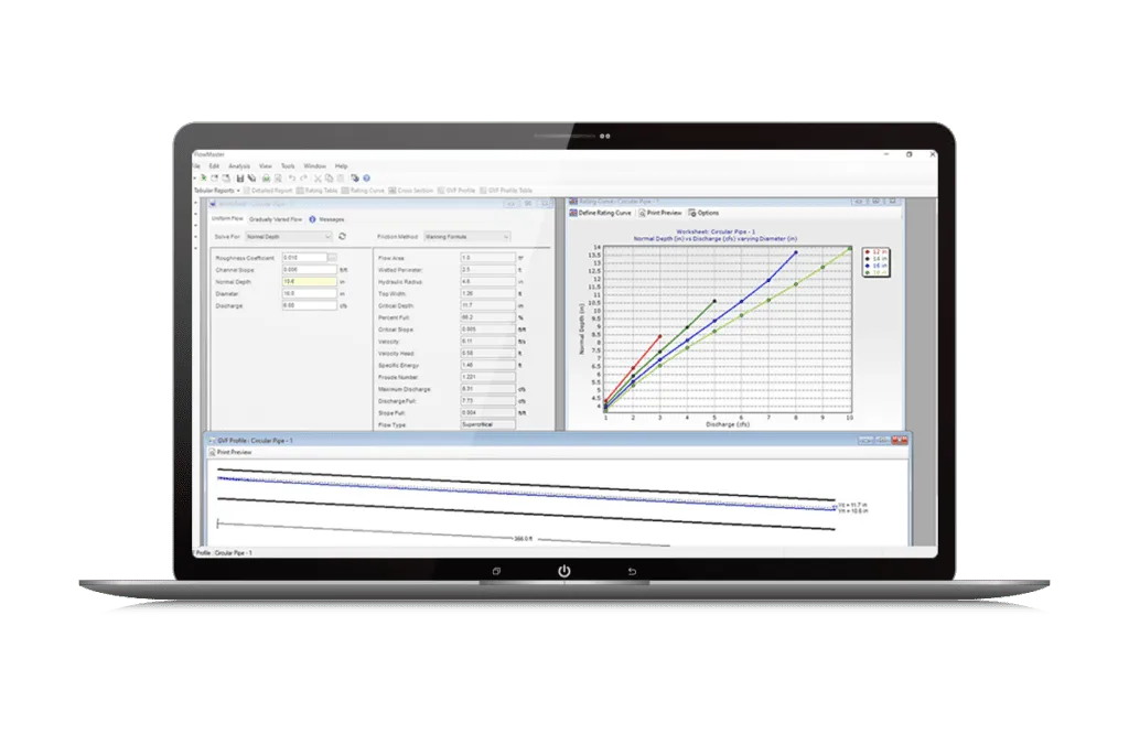 - Produce detailed reports, rating curves, and flow profiles. Design and Analyze Any Type of Hydraulic Element Pipe Design Solver can solve for your specified pipe length, start or stop elevation, pressure, discharge, diameter, or roughness. Inlet and Gutter Hydraulic Calculator is based on Federal Highway Administration (FHWA) Hydraulic Engineering Circular No. 22 methodologies, and includes grate, curb, combination, ditch, and slotted-drain inlets, for both on-grade and in-sag installations. Open-Channel Hydraulics Calculator solves for discharge, capacity, normal depth, gradually varied flow profile, channel dimensions, slope, or roughness, and allows the user to choose a weighted roughness method. Weir and Orifice Calculators can be used to evaluate and size rectangular, broad-crested, V-notch, and Cipolletti weir types, and rectangular, circular, and generic orifice structures.